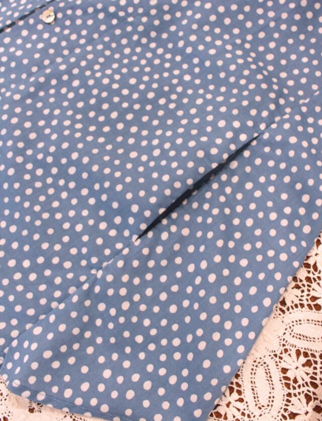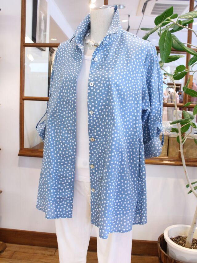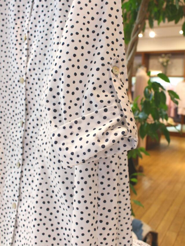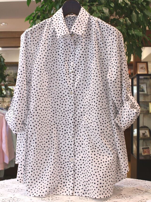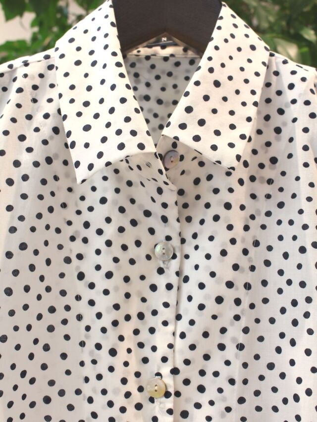手書き風の水玉柄が愛らしい、しなやかな綿ローン生地をふんわりAラインシルエットのトップスに仕上げました。