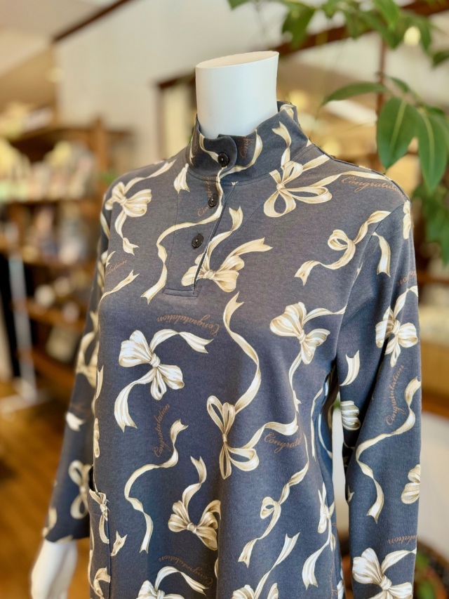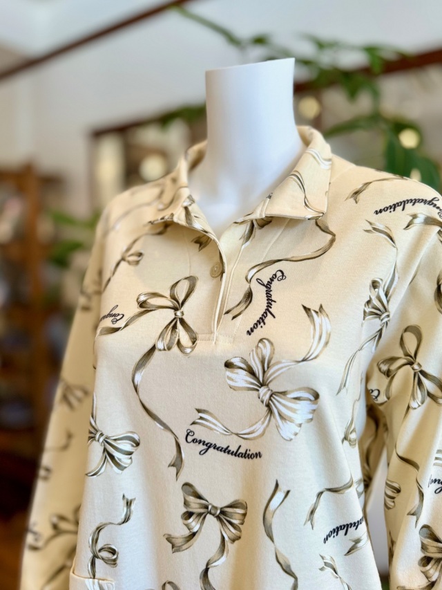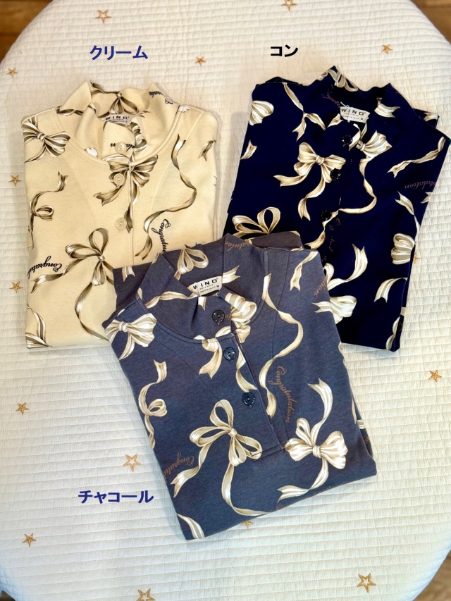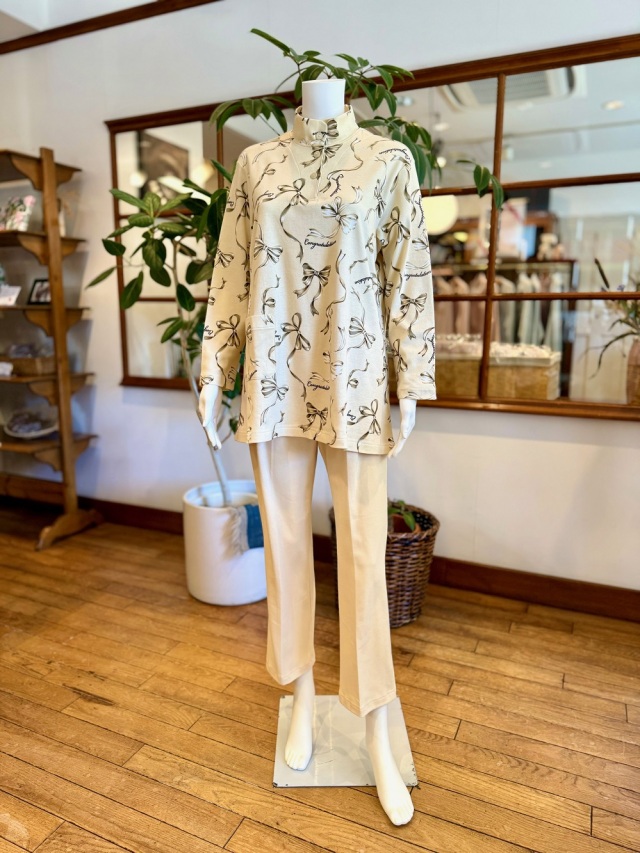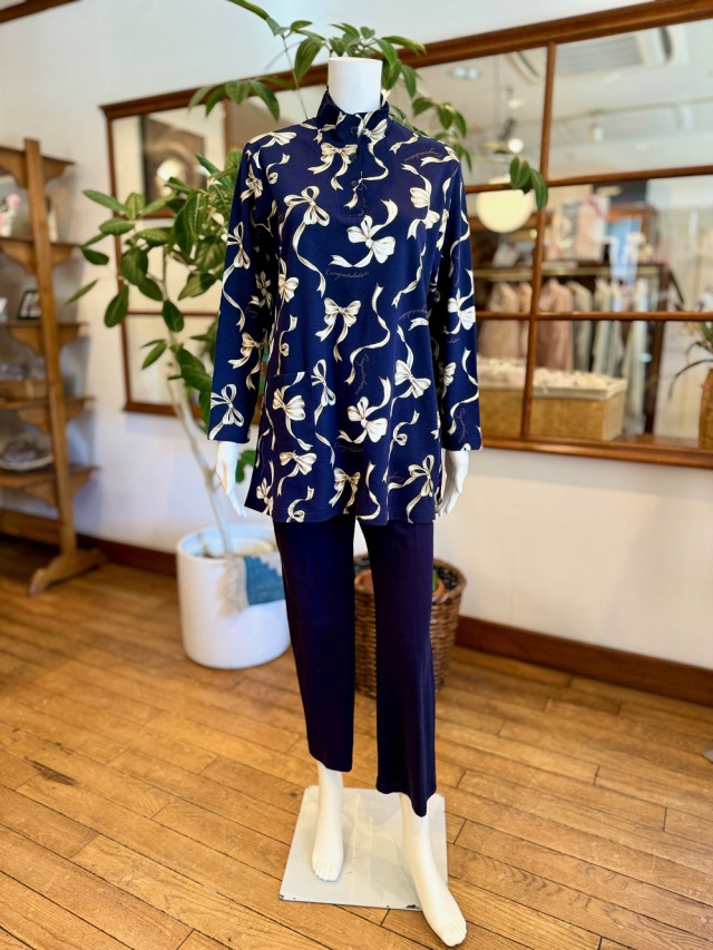 華やかなリボン柄がお洒落な上衣に、無地のパンツの組み合わせがエレガントなパジャマです。