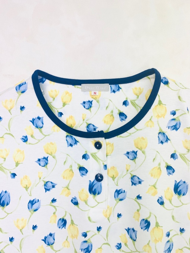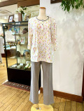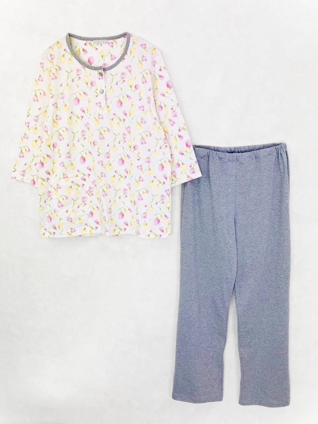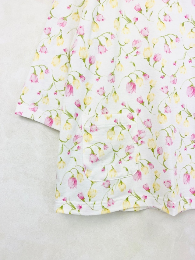 春らしいチューリップ柄が散りばめられた綿100%の天竺パジャマです。