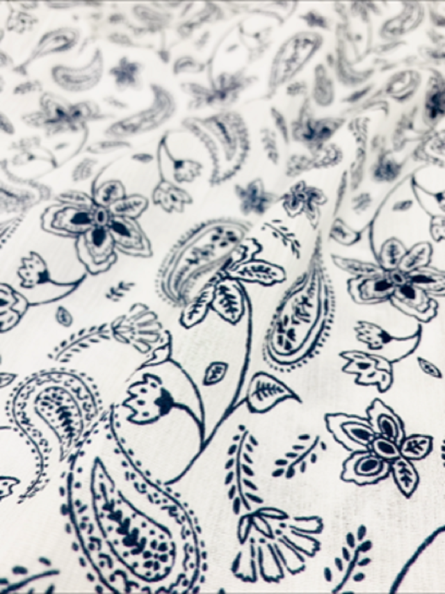 シンプルな色使いの華やかなペイズリー柄に無地のパンツを合わせました。
