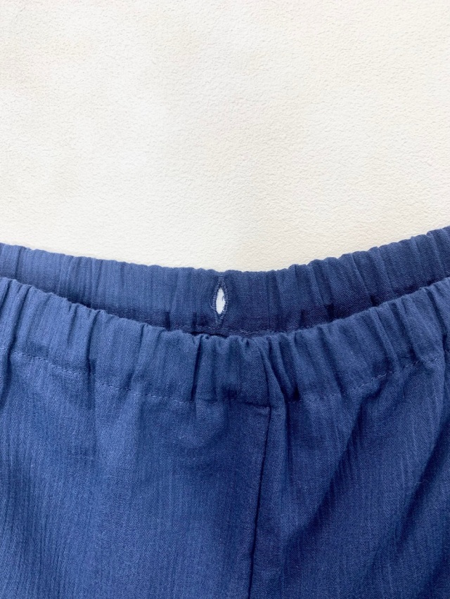 前ボタン5個、ポケット1個、ウエスト総ゴム、ゴムの替え口あり。