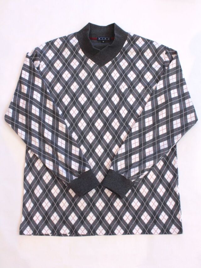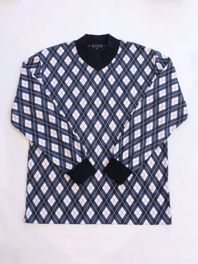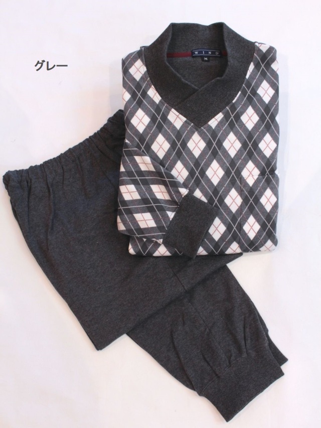 おしゃれなアーガイル柄に無地のパンツの組み合わせはお部屋着感覚でお召し頂けます。