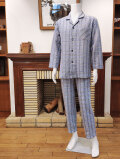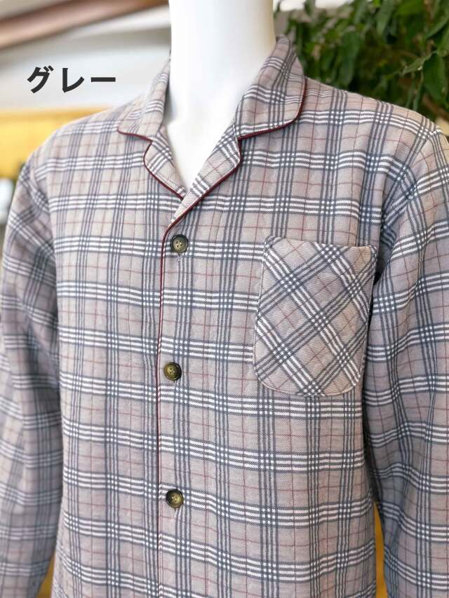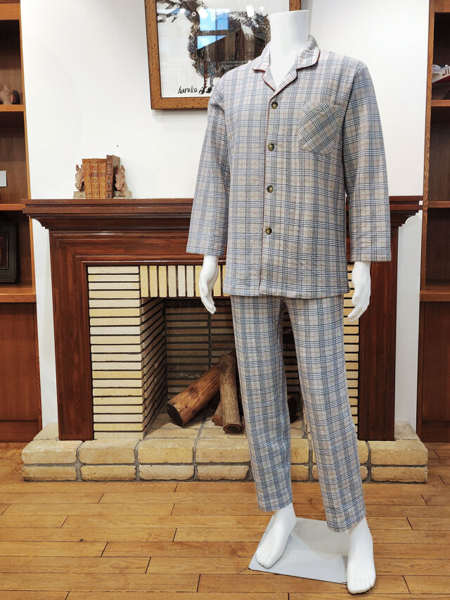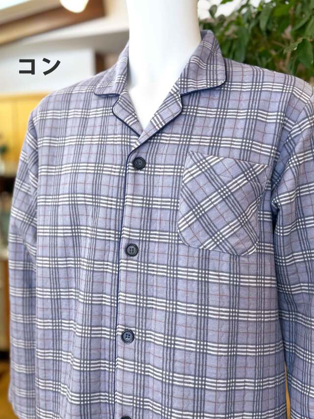 前ボタン4個、左胸ポケット1個、ウエスト総ゴム、パンツ前開きあり。