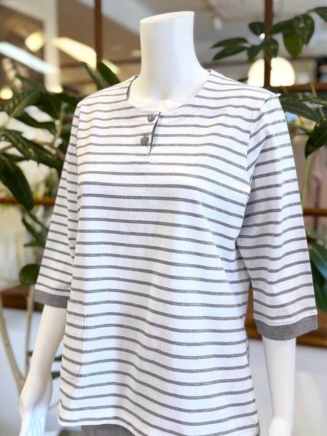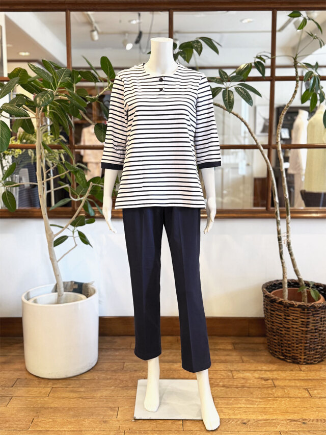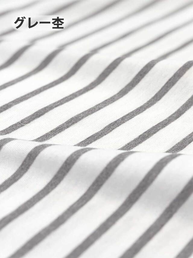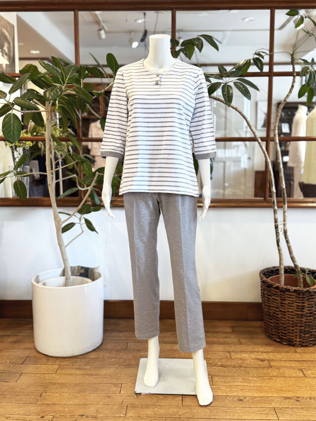衿なしのスッキリとしたデザインで、シンプルなボーダーと無地のセットアップは年代を問わず人気。