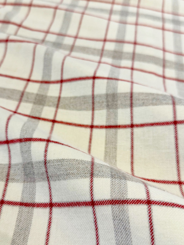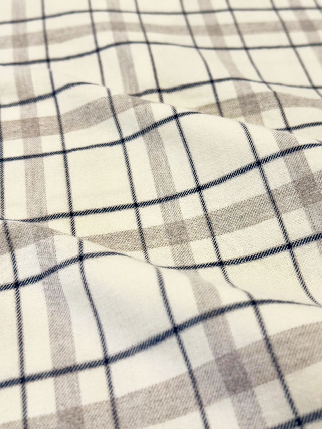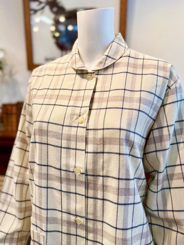 襟元にパイピングを施し、暖かみのあるオフホワイトの地色にチェック柄を施しました。